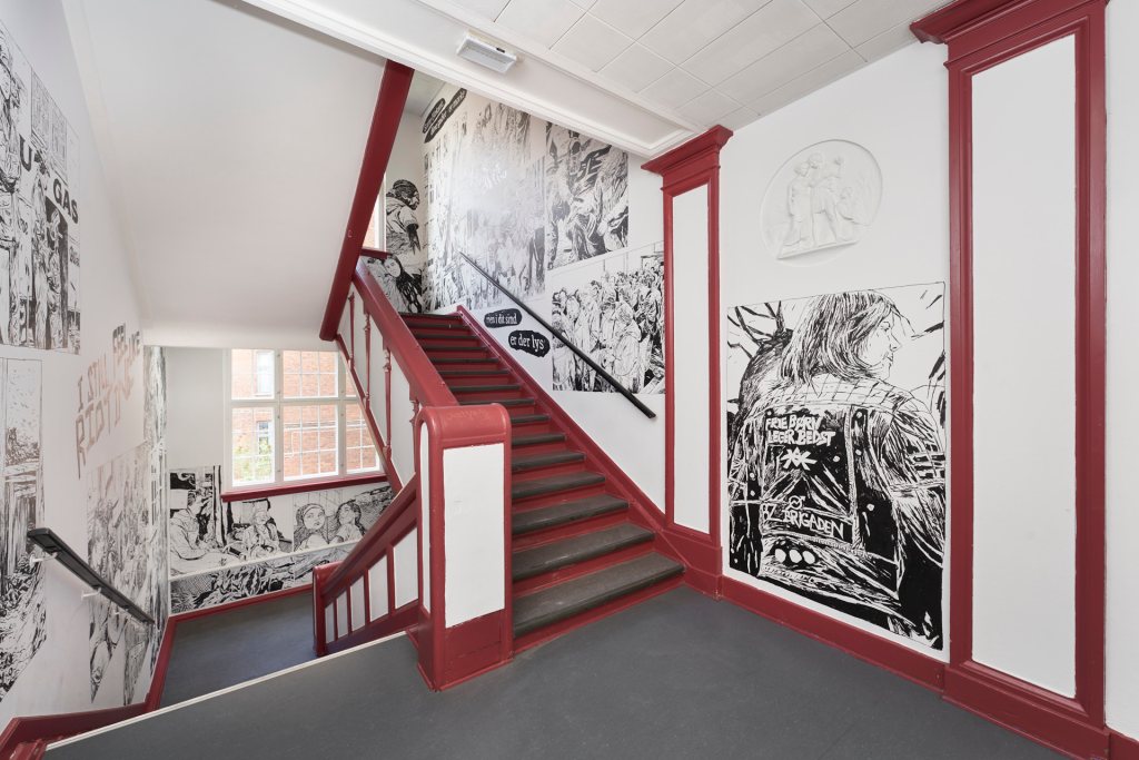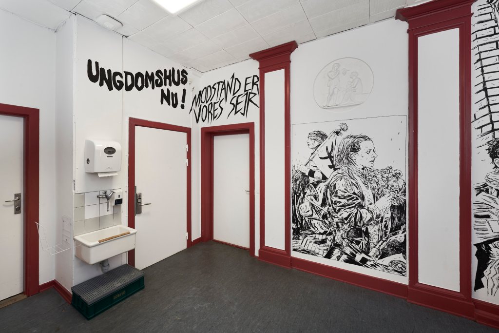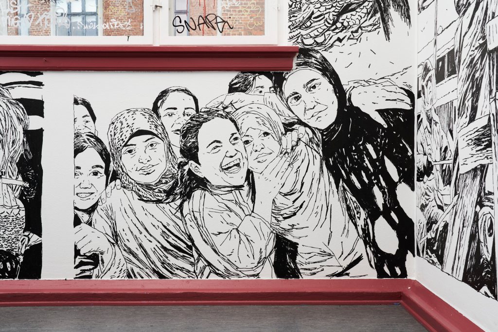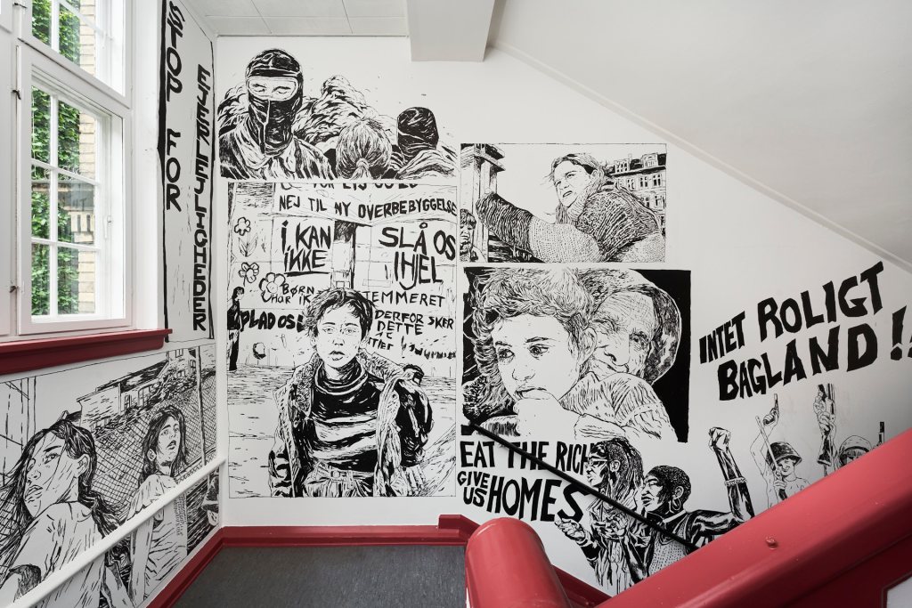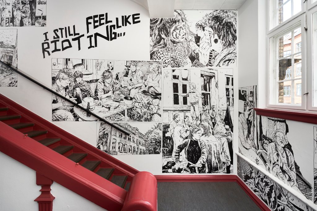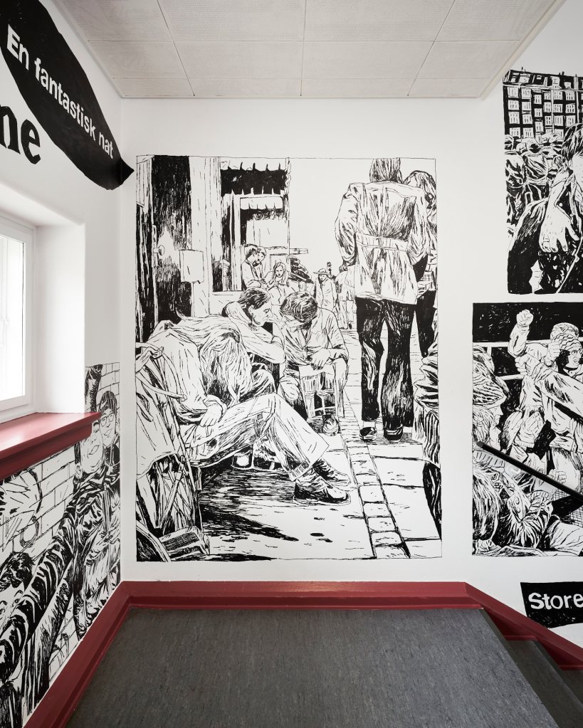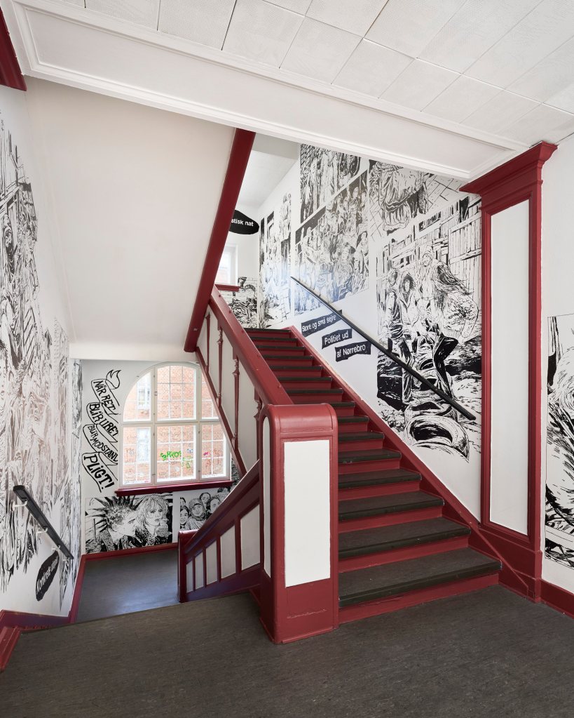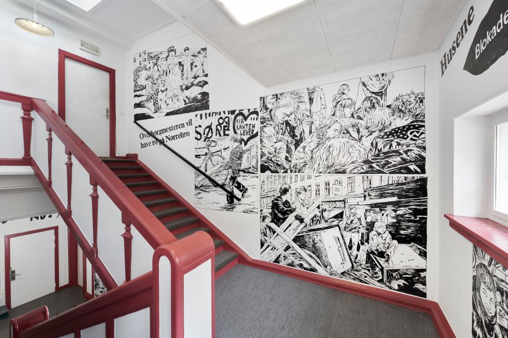 Permanent walldrawing in the shared entrance of the Community Centre K44 and Byhøjskolen CPH.